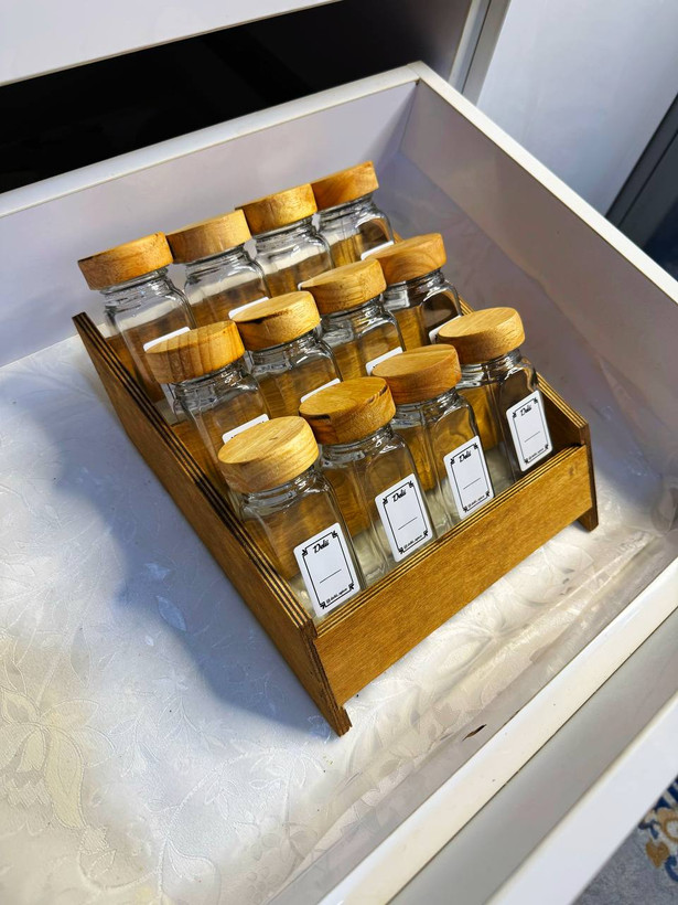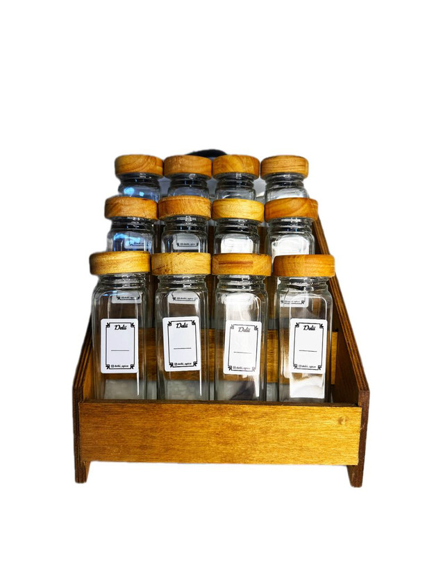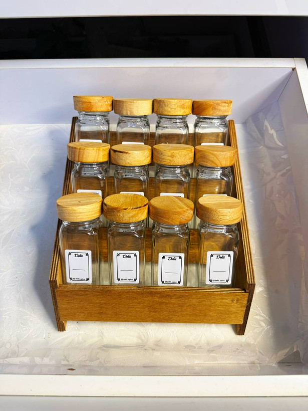 این پک ۱۲تا جا ادویه ی درب چوبی دارد