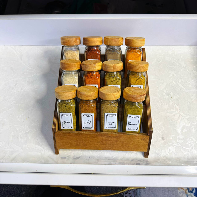 جا ادویه ی ۱۲ تایی درب چوبی با استند کشویی (با ادویه ی مرغوب اهواز)(ارسال رایگان)