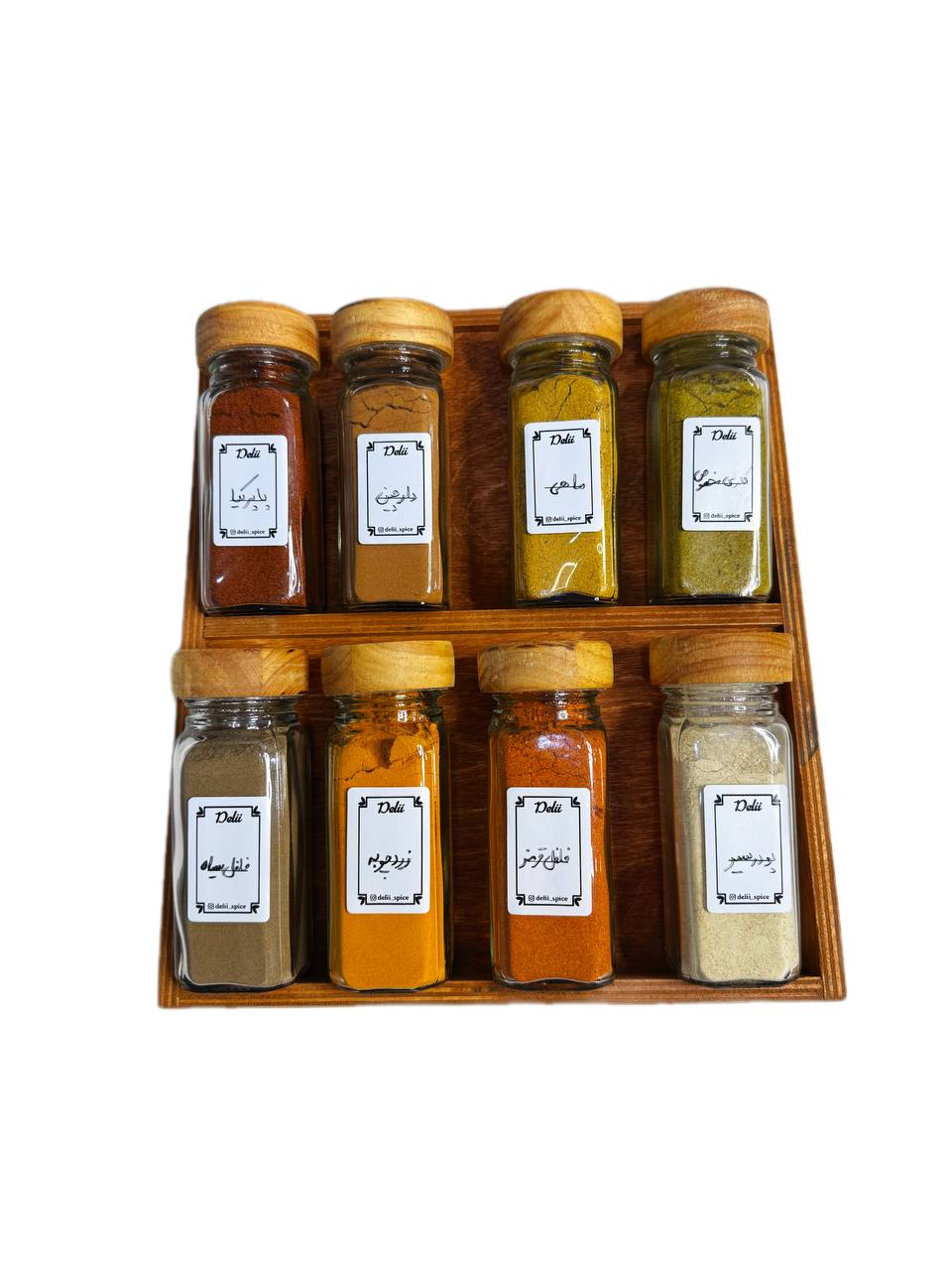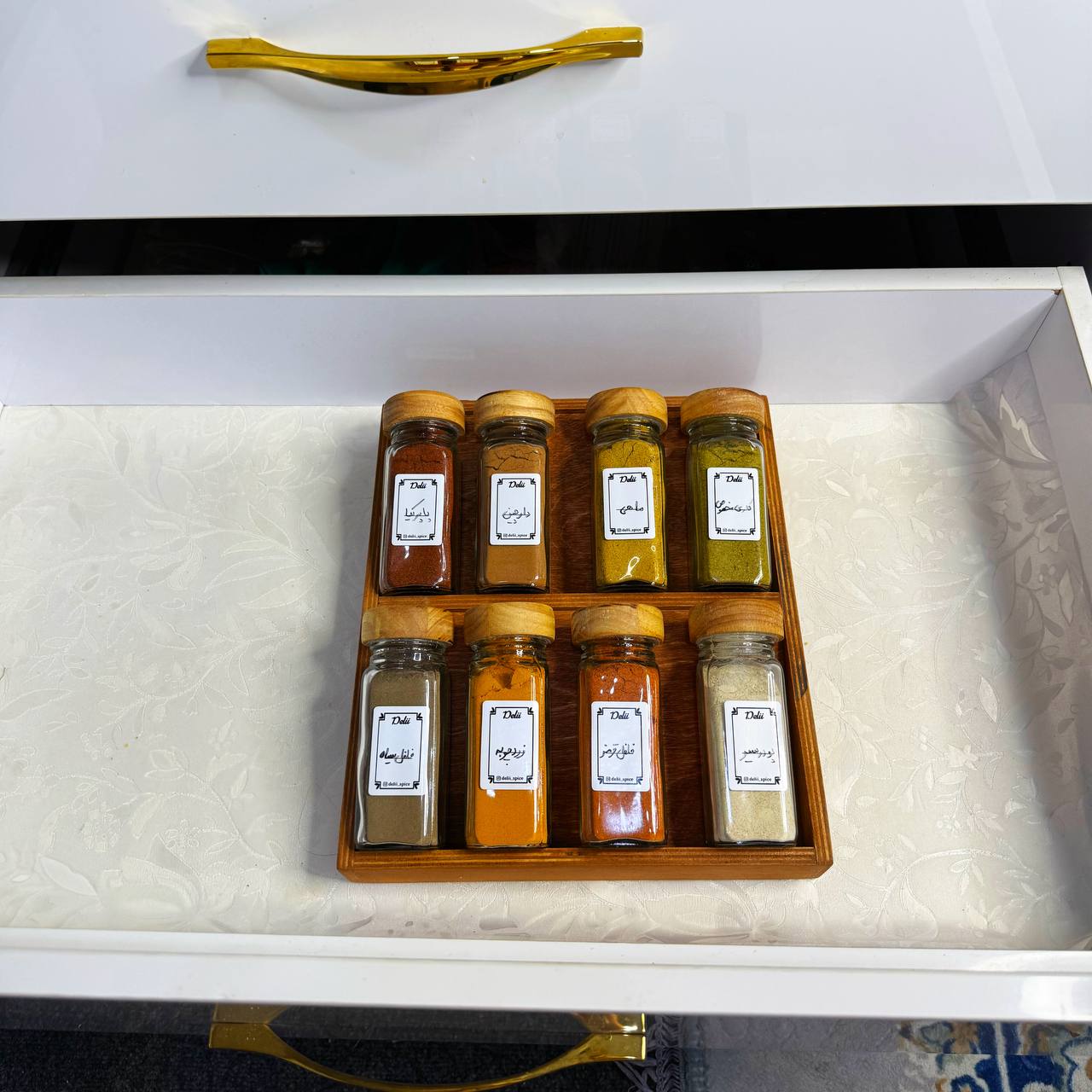 جا ادویه ی ۸ تایی درب چوبی با استند کشویی (با ادویه ی مرغوب اهواز)(ارسال رایگان)