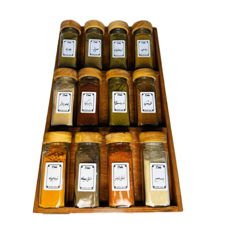 جا ادویه ی ۱۲ تایی درب چوبی با استند کشویی (با ادویه ی مرغوب اهواز)(ارسال رایگان)